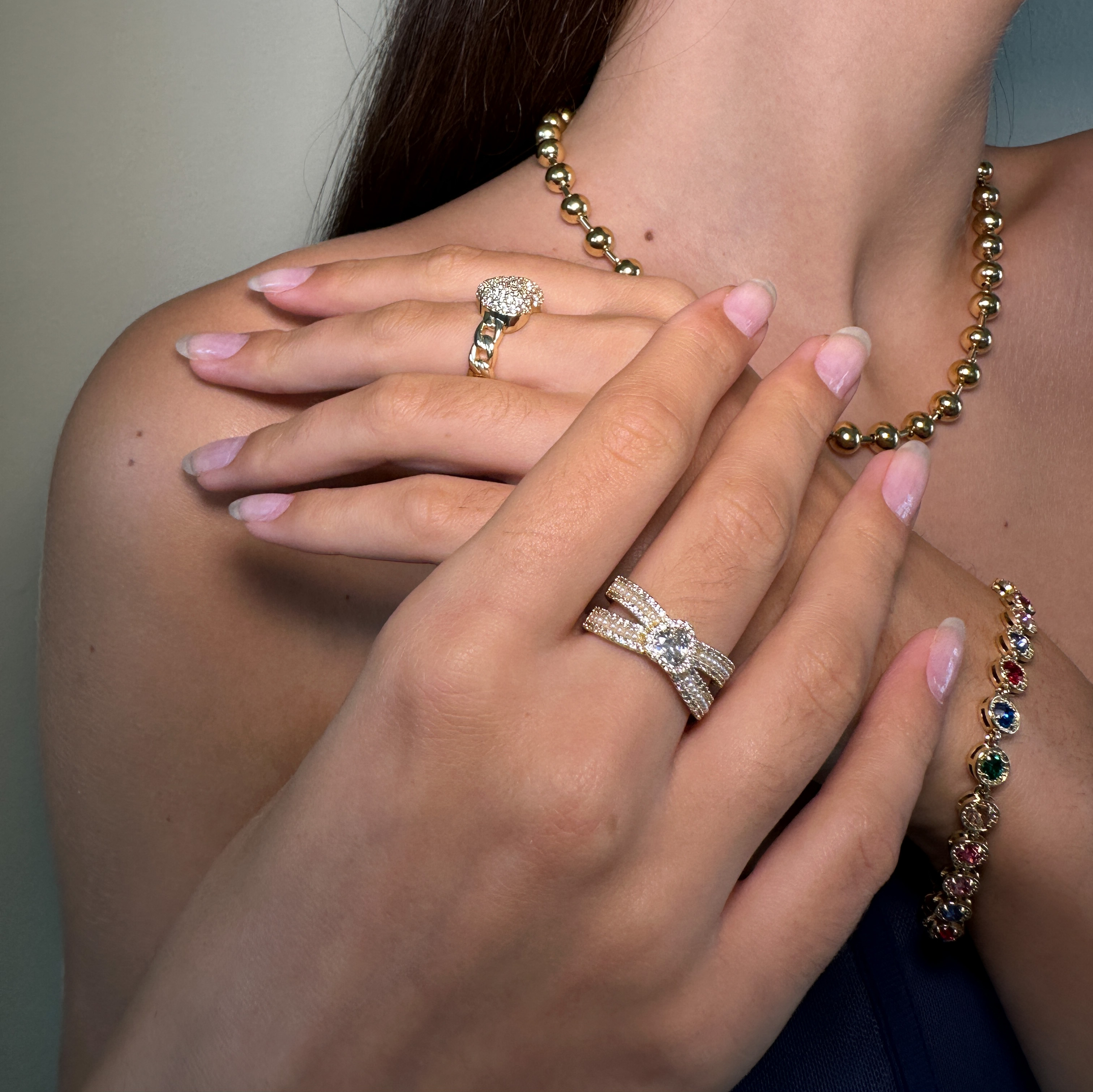 Ένα εντυπωσιακό δαχτυλίδι που μαγνητίζει τα βλέμματα, στολισμένο με πολύτιμους λίθους και λεπτομέρειες που αποπνέουν πολυτέλεια και κομψότητα. Ο επιβλητικός σχεδιασμός του, είτε με μοντέρνες γεωμετρικές γραμμές είτε με κλασικά μοτίβα, αγκαλιάζει το δάχτυλο και αναδεικνύει κάθε κίνηση, κάνοντάς το ιδανικό για ξεχωριστές εμφανίσεις που απαιτούν λάμψη και κύρος.
