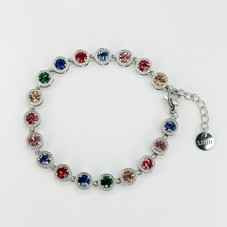 Απογειώστε την εμφάνισή σας με αυτό το κομψό βραχιόλι, διακοσμημένο με λαμπερά ζιργκόν. Η εκλεπτυσμένη του κατασκευή και το εκθαμβωτικό του φινίρισμα προσδίδουν διαχρονική πολυτέλεια και λάμψη. Ιδανικό για ξεχωριστές περιστάσεις ή καθημερινές στιγμές κομψότητας.